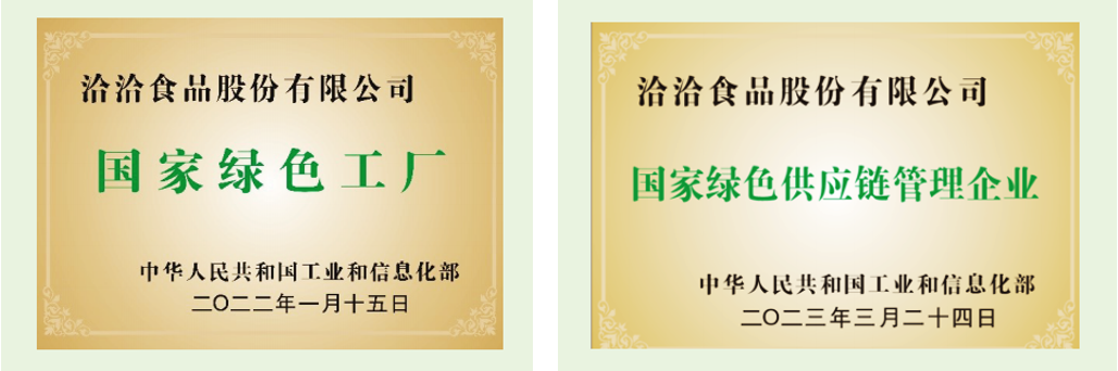 千亿国际食品国家绿色工厂、国家绿色供应链管理企业证书